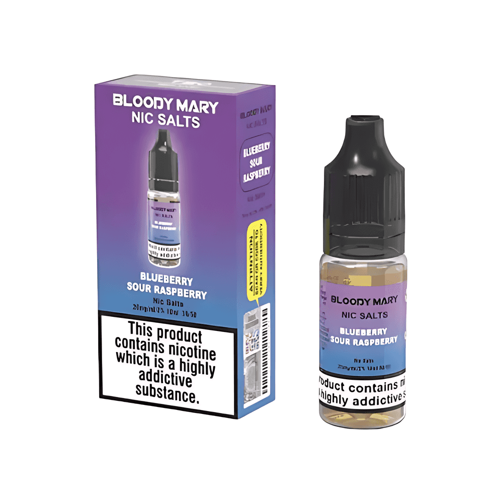 10ml of Bloody Mary Nic Salt Blue Sour Raspberry E-Liquid. Nic-salt e-liquid that is bottled and matches the flavors found in Bloody Mary disposable vaporizers.