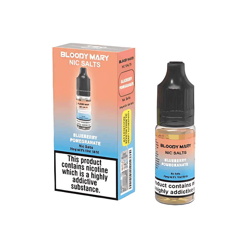 10ml of Bloody Mary Nic Salt Blueberry Pomegranate E-Liquid. Nic-salt e-liquid that is bottled and matches the flavors found in Bloody Mary disposable vaporizers.