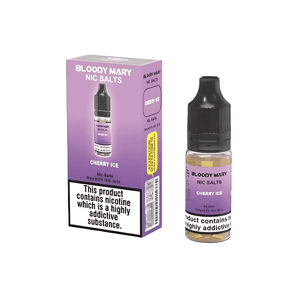 10ml of Bloody Mary Nic Salt Cherry Ice E-Liquid. Nic-salt e-liquid that is bottled and matches the flavors found in Bloody Mary disposable vaporizers.