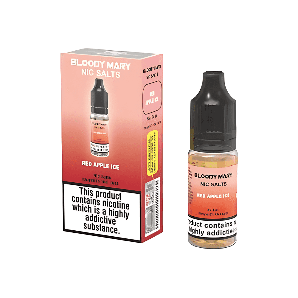 10ml of Bloody Mary Nic Salt Red Apple Ice E-Liquid. Nic-salt e-liquid that is bottled and matches the flavors found in Bloody Mary disposable vaporizers.
