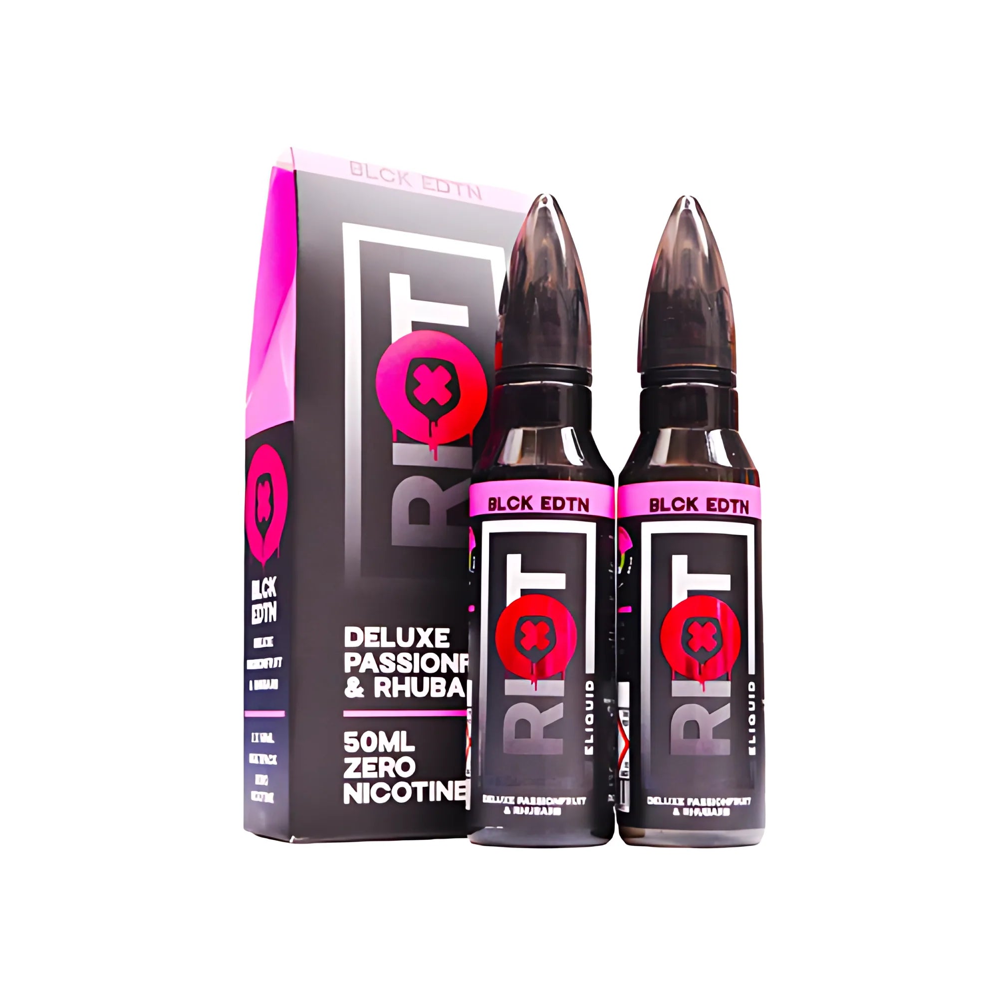 Riot Squad Deluxe Passionfruit Rhubarb 100ml Shortfill has an exotic passionfruit top layer and a crisp, acidic rhubarb base. Exactly balanced between the tangy rhubarb notes that emerge on the exhale and the sweeter passionfruit tones.