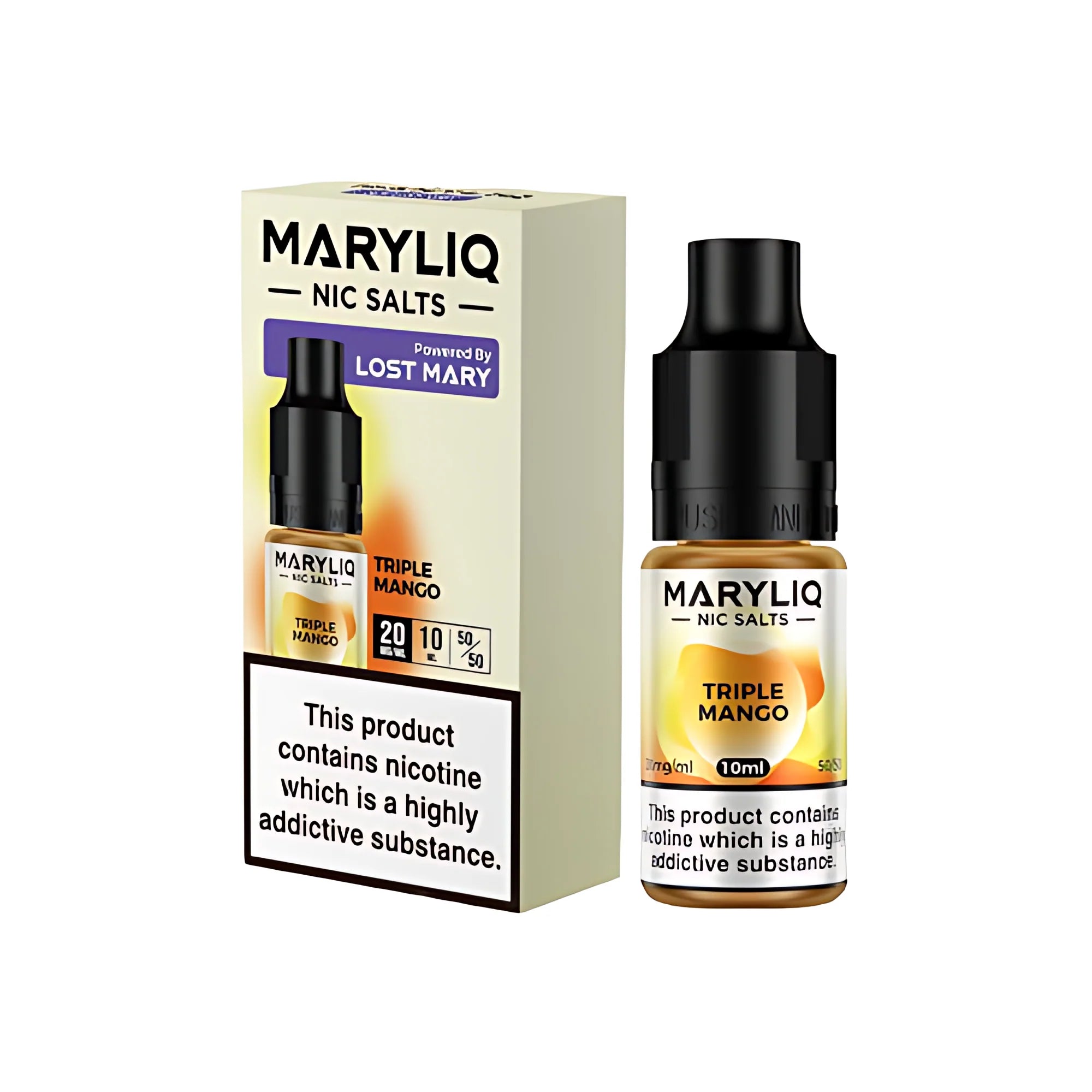 Savor Maryliq Triple Mango Ice nic salt, available in nicotine concentrations of 10 mg or 20 mg.